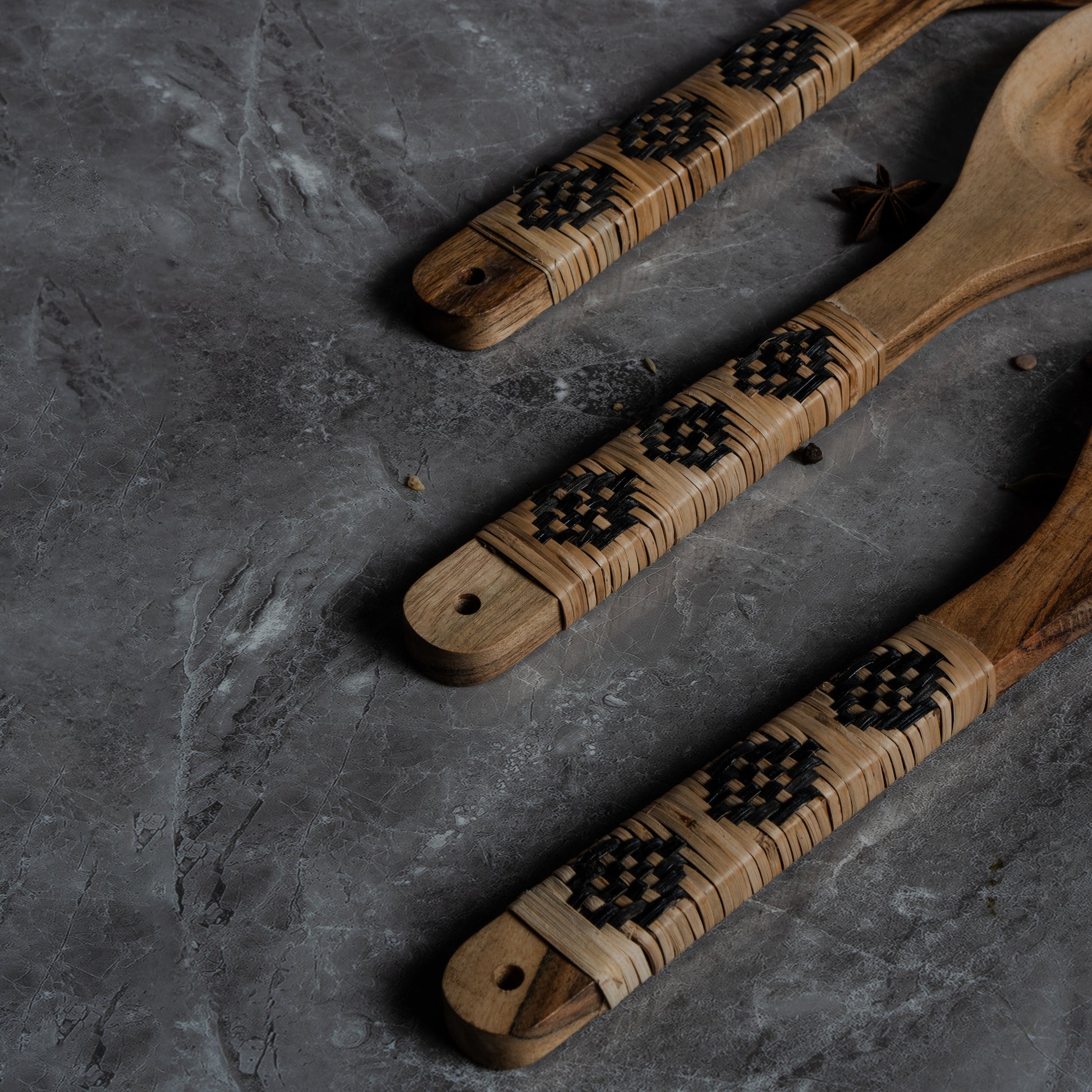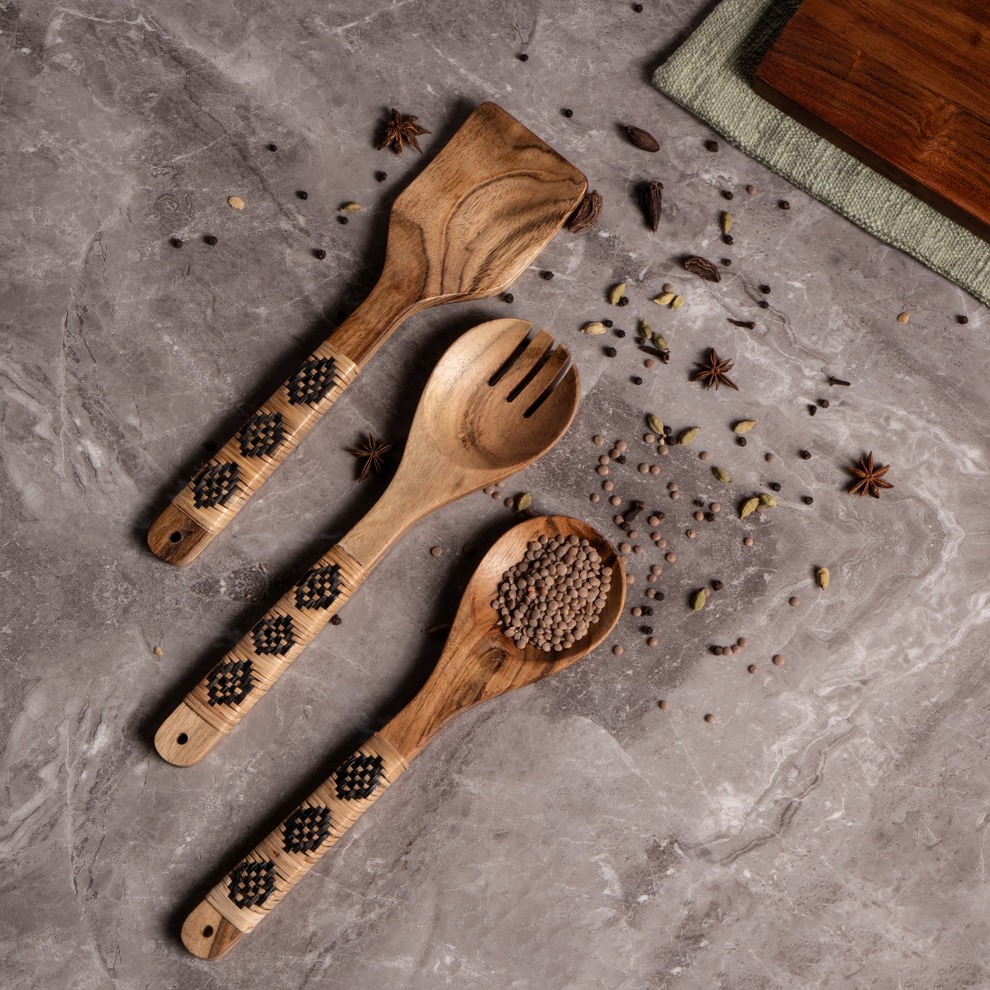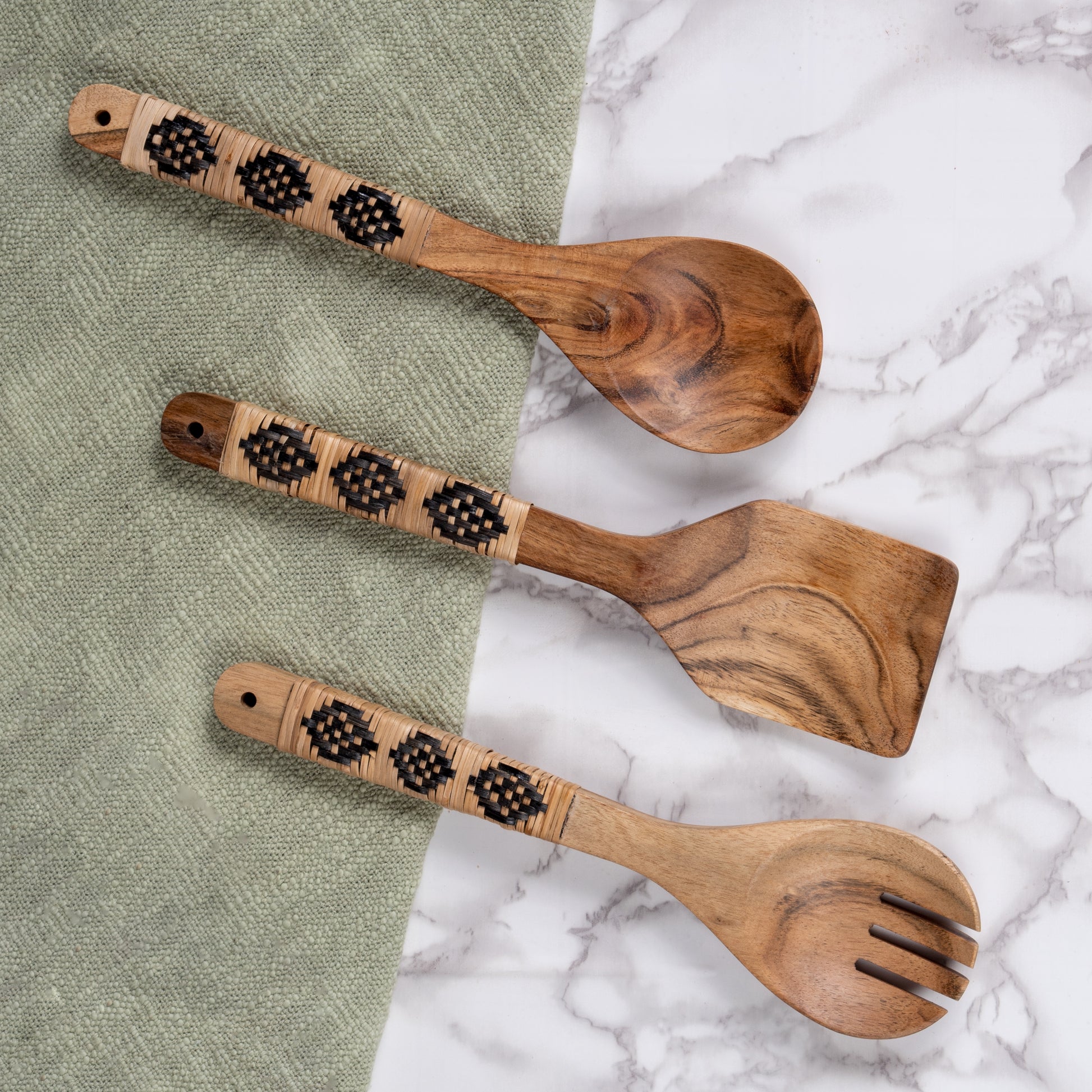 Acacia Wood Utensils Set with Wooven Bamboo Handles