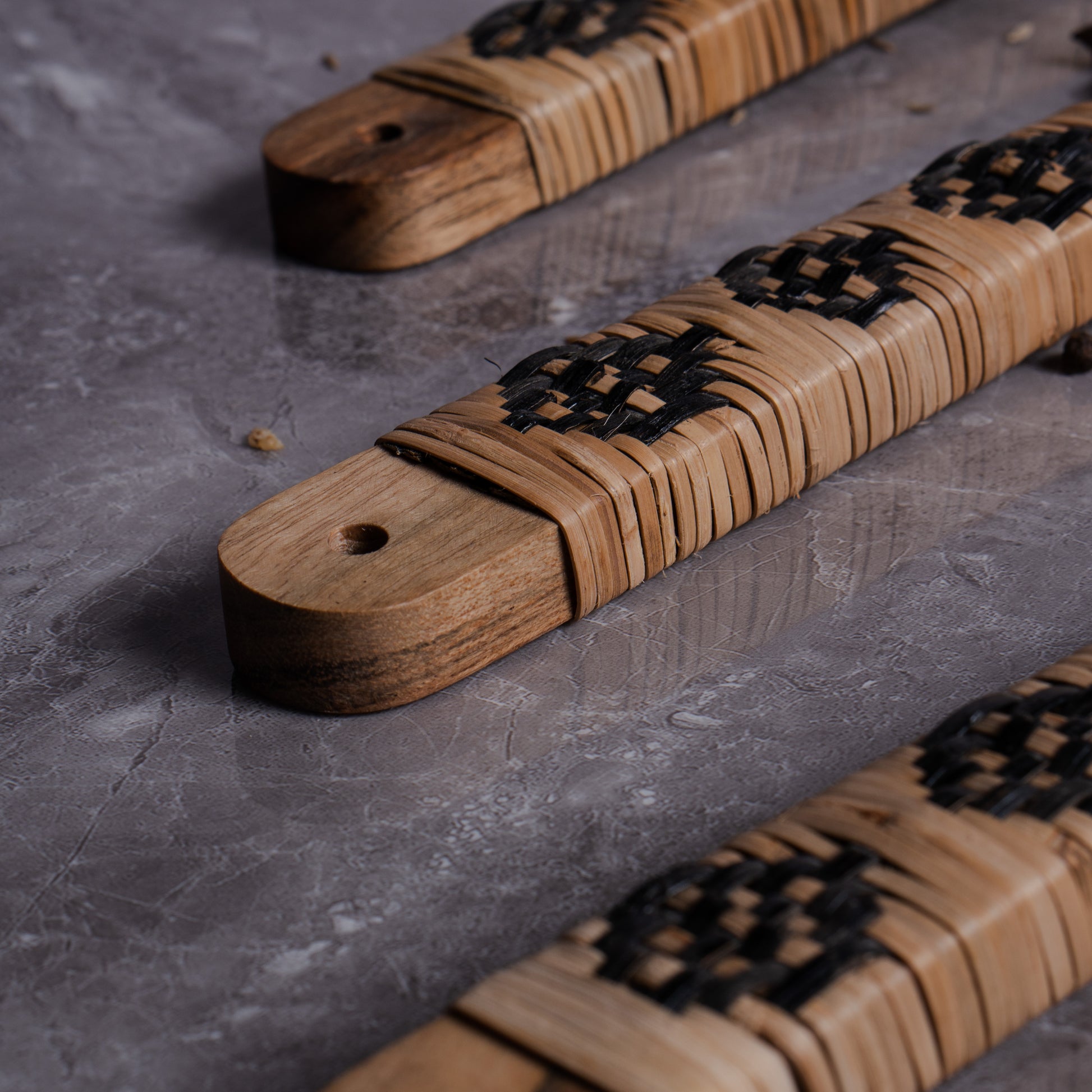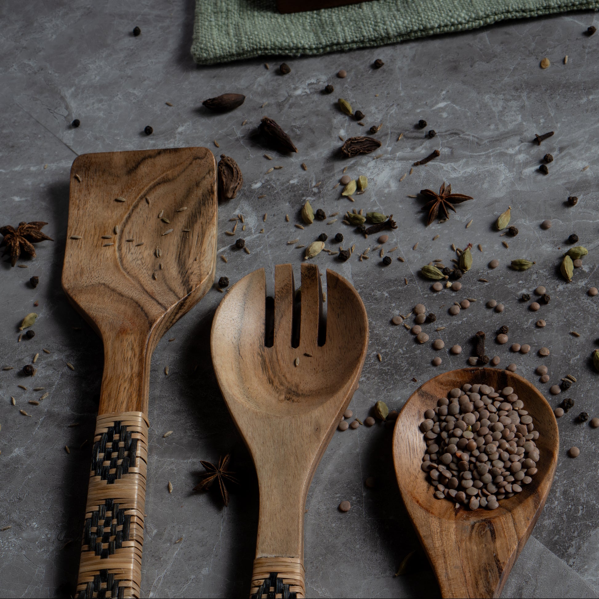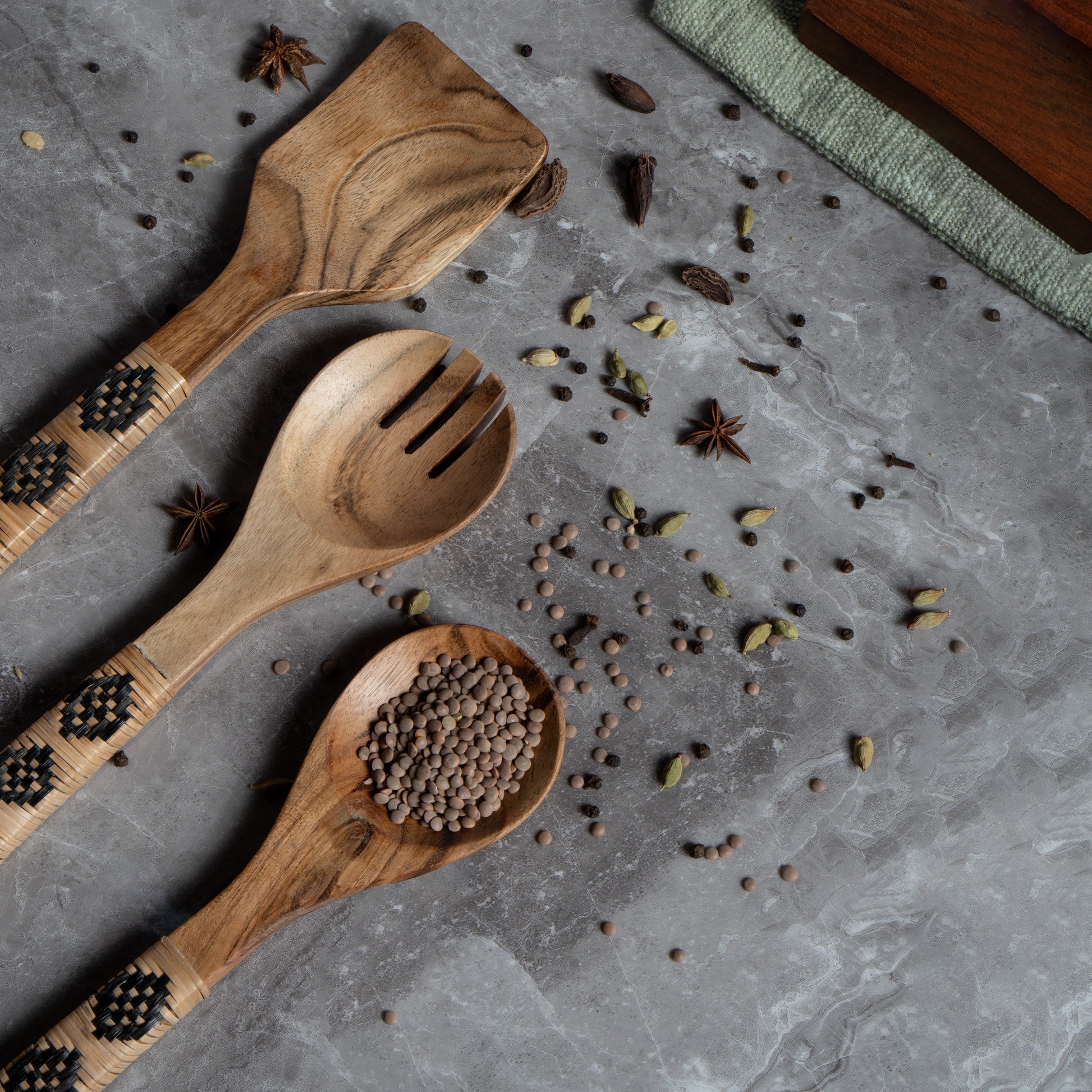 Acacia Wood Utensils Set with Wooven Bamboo Handles