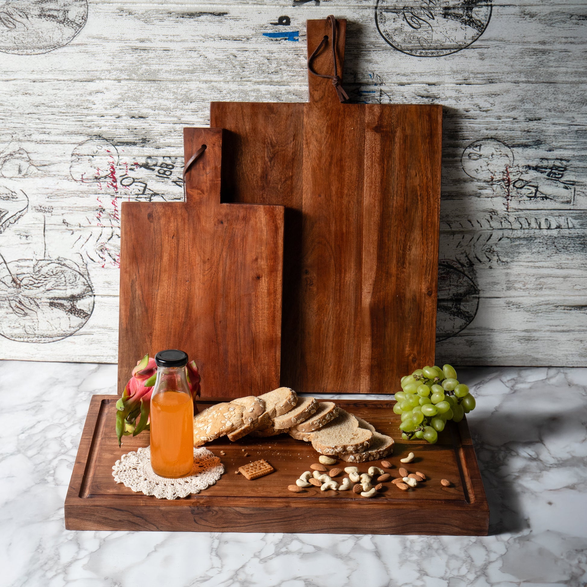 Elevate your meal preparation with this large acacia wood cutting board. It features an oversized trencher design and a practical grooved edge to catch juices and keep your workspace clean. Crafted from durable, sustainably harvested acacia wood, it offers a sturdy surface perfect for heavy-duty cutting, slicing, and serving in hotels, restaurants, or at home.