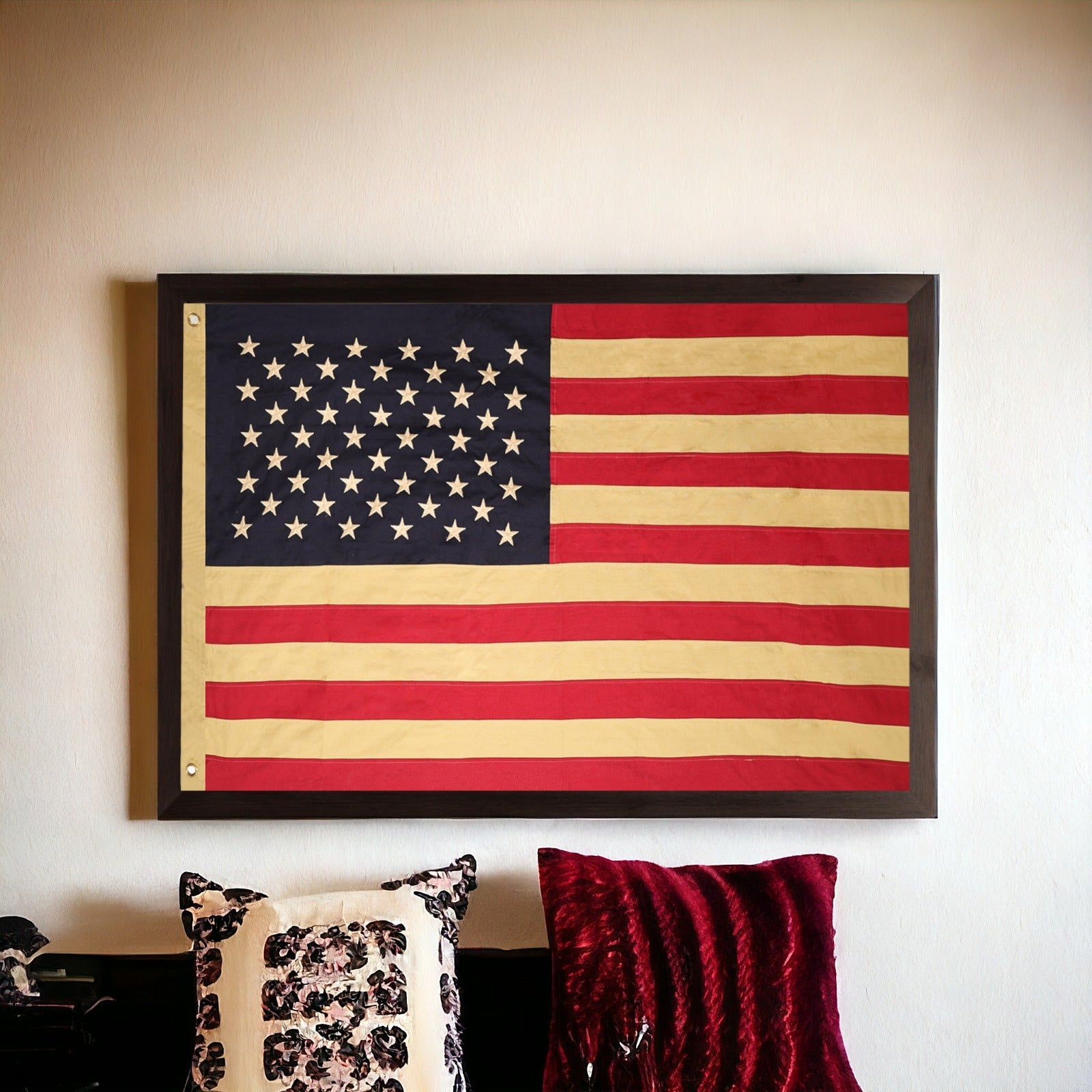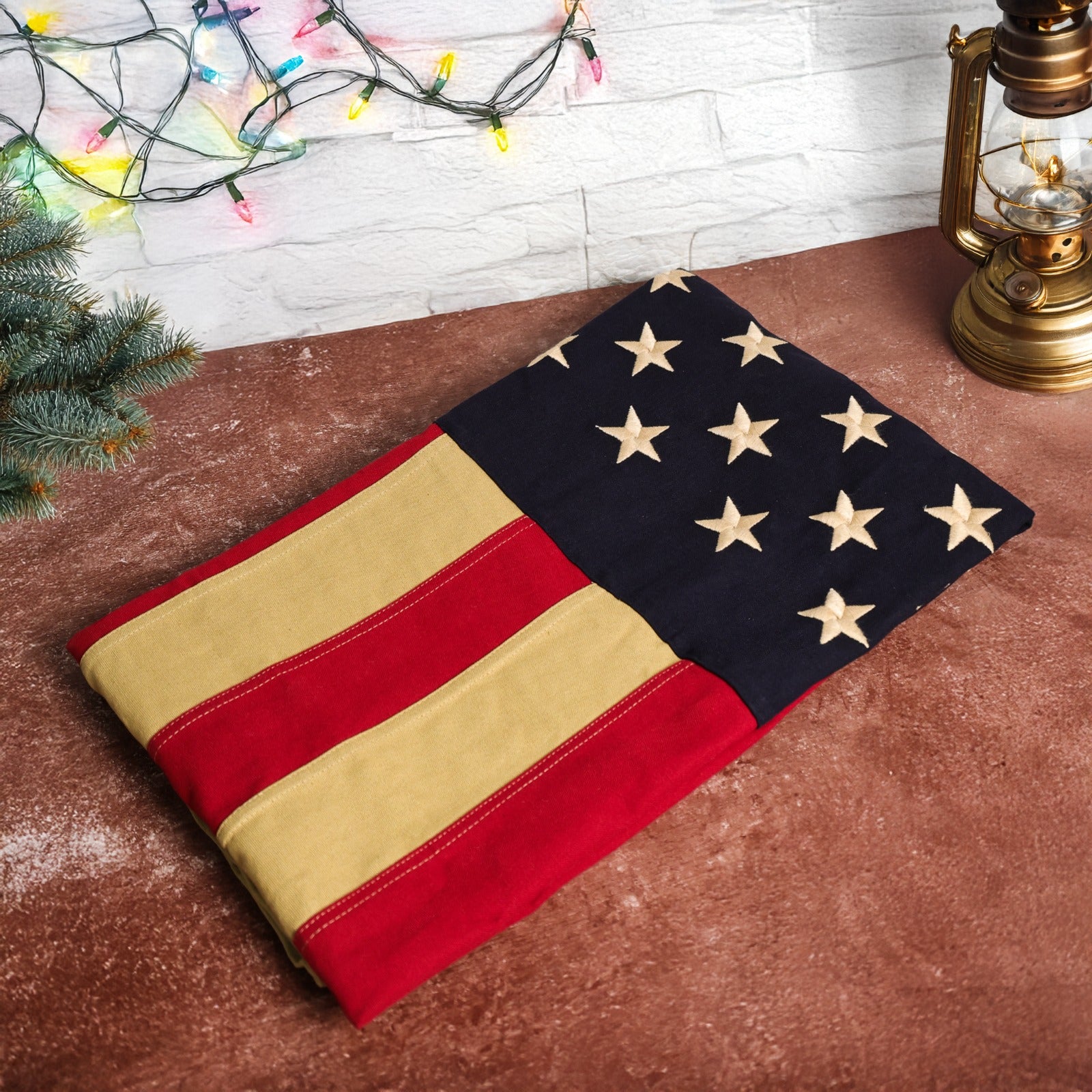 Elevate your home decor with our Vintage Farmhouse Elegance American Flag. Crafted from 100% soft cotton, this flag offers a luxurious feel and lasting durability. Intricately hand embroidered and vintage washed, it features a charming beige tone, perfect for any style. Measuring 60x36 inches, it's ideal for decorating walls, patios, or furniture. Each flag comes with a heartfelt thank-you card, making it a thoughtful gift or personal tribute. Order now for a touch of rustic patriotism.